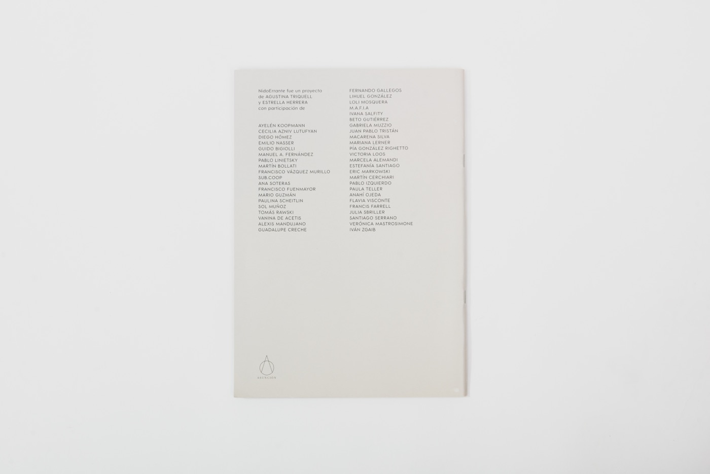 NidoErrante es un proyecto de Agustina Triquell y Estrella Herrera con participación de Ayelén Koopmann, Cecilia Azniv Lutufyan, Diego Hómez, Emilio Nasser, Guido Bigiolli, Manuel A. Fernández, Pablo Linietsky, Martín Bollati, Francisco Vázquez Murillo, Sub.Coop, Ana Soteras, Francisco Fuenmayor, Mario Guzmán, Paulina Scheitlin, Sol Muñoz, Tomás Rawski, Vanina De Acetis, Alexis Mandujano, Guadalupe Creche, Fernando Gallegos, Lihuel González, Loli Mosquera, M.A.F.I.A, Ivana Salfity, Beto Gutiérrez, Gabriela Muzzio, Juan Pablo Tristán, Macarena Silva, Mariana Lerner, Pía González Righetto, Victoria Loos, Marcela Alemandi, Estefanía Santiago, Eric Markowski, Martín Cerchiari, Pablo Izquierdo, Paula Teller, Anahí Ojeda, Flavia Visconte, Francis Farrell, Julia Sbriller, Santiago Serrano, Verónica Mastrosimone, Iván Zgaib.
